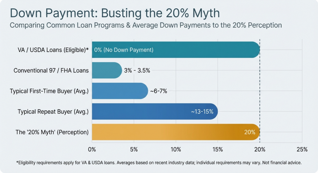 One of the biggest misconceptions stopping renters from becoming buyers is the belief that you need a 20% down payment. While putting 20% down helps you avoid Private Mortgage Insurance (PMI), it is not a requirement for buying a home.